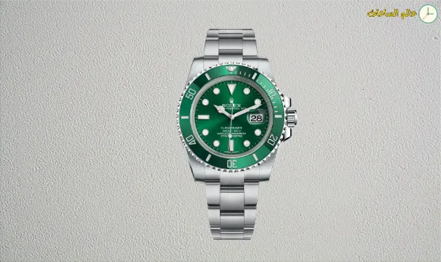 - مصنوعة من الفولاذ القوي المقاوم للصدأ كعادة ساعات رولكس، وبها مينا خضراء تحتوي على نافذة تاريخ.